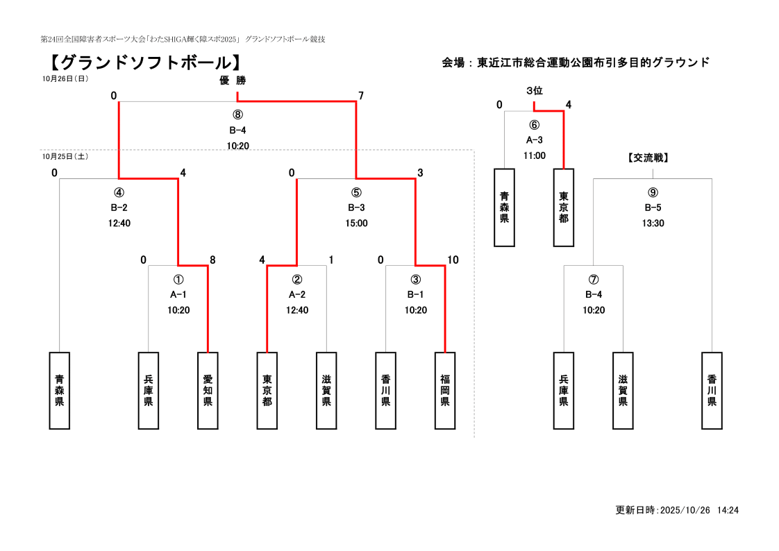 福岡県、4年連続10回目の優勝!! 福岡県は、1回表保坂の2塁打で先制。 3回表には西村の本塁打、持丸の3塁打などで3点を追加、さらに4回表には持丸の2塁打の他、安打2本や四球で3点をもぎとり、試合を決定づけた。 守備では全盲の三塁手野田が素早い動きで7つの刺殺を記録し、福岡県の勝利に大いに貢献。 投手の全盲宇土は、雨でボールがすべりやすい中、速球を中心に好投し、愛知県打者を見事4安打完封におさえた。 悪天候での試合であったが、両チームとも互いの健闘を称え合い、笑顔で今大会を締めくくった。 決勝戦 愛知県 対 福岡県.pdf